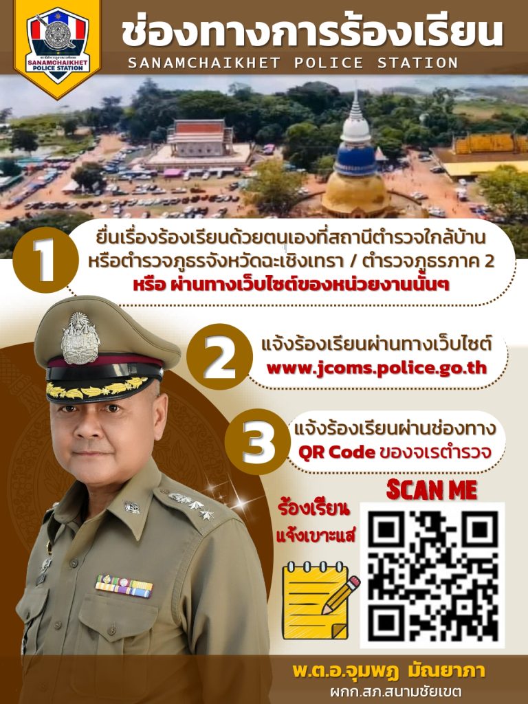 1.ยื่นเรื่องร้องเรียนด้วยตนเองที่สถานีตำรวจใกล้บ้านหรือตำรวจภูธรจังหวัดฉะเชิงเทรา / ตำรวจภูธรภาค 2 หรือ ผ่านทางเว็บไซต์ของหน่วยงานนั้นๆ