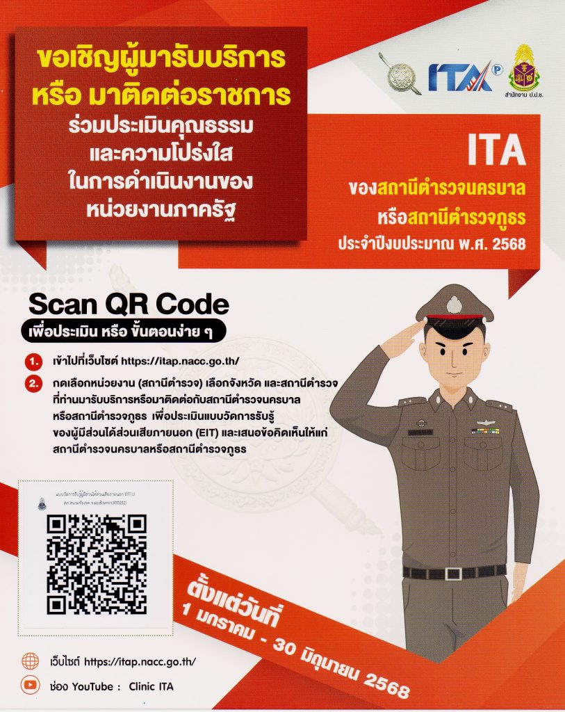 ขอเชิญผู้มารับบริการ หรือผู้มาติดต่อราชการ ร่วมประเมิน “คุณธรรมและความโปร่งใสในการดำเนินงานของหน่วยงานราชการ(Integrity and Transparency Assessment:ITA) ตั้งแต่วันที่ 1 มกราคม – 30 มิถุนายน 2568 https://itap.nacc.go.th/s/E169772749
